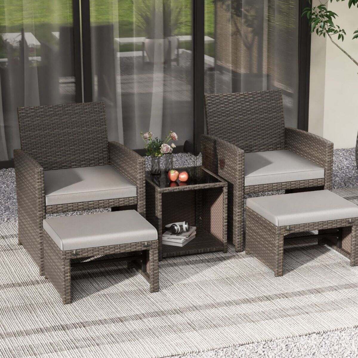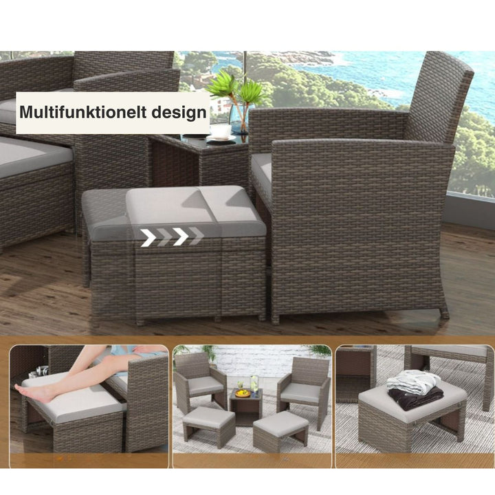 Vores rattanmøbler er virkelig smukke og derfor den perfekte tilføjelse til din have! Bestående af 5 dele, inkluderer den 2 lænestole, 2 puffer og 1 sofabord med glasplade. Lænestolene og puferne er understøttet af en robust stålramme og forstærket af en X-formet struktur, hvilket gør sættet vejrbestandigt og holdbart. Takket være polstringen tilbyder sæderne dig et højt komfortniveau. Lynlåsene gør det også nemt at tage betrækkene af og vaske dem. Bordet tilbyder masser af plads til opbevaring af genstande.