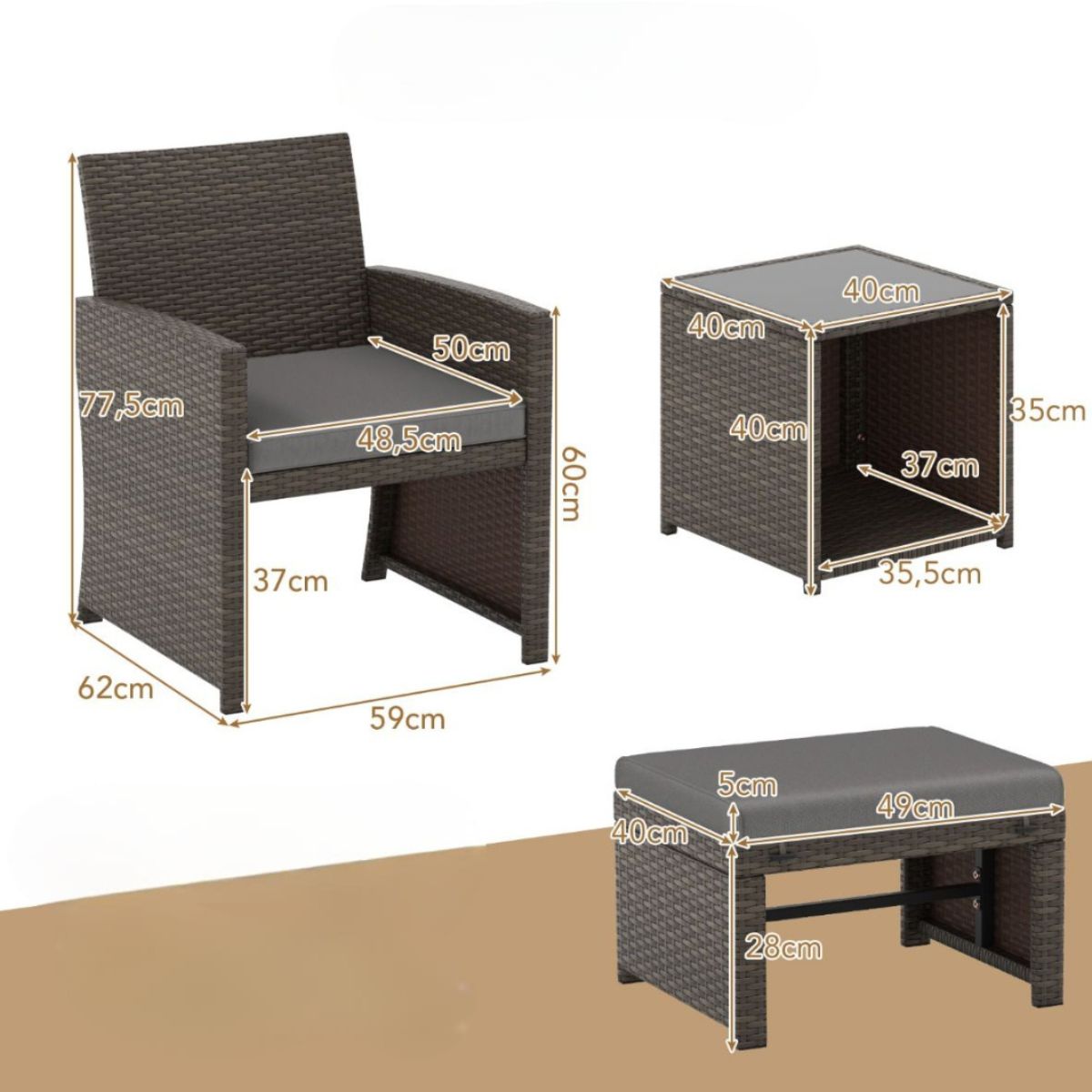 Materiale | PE rattan + skum + hærdet glas |