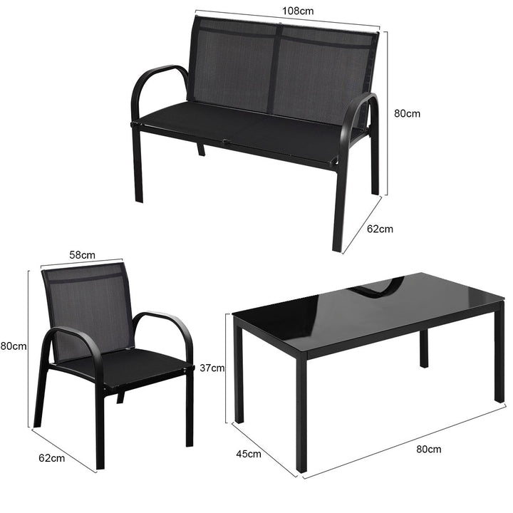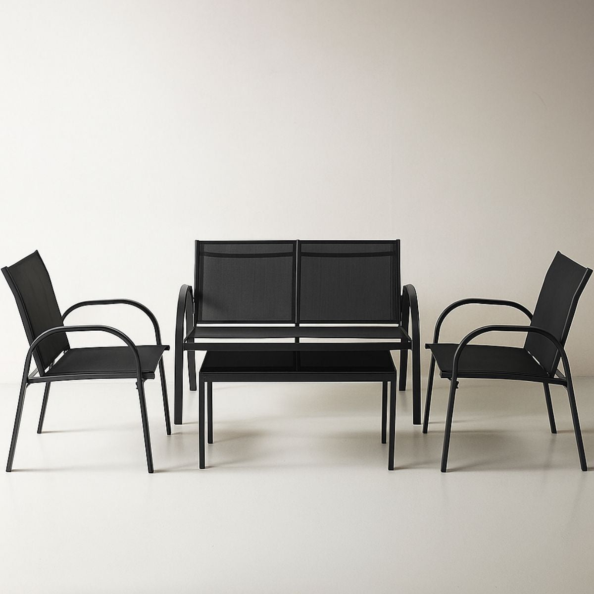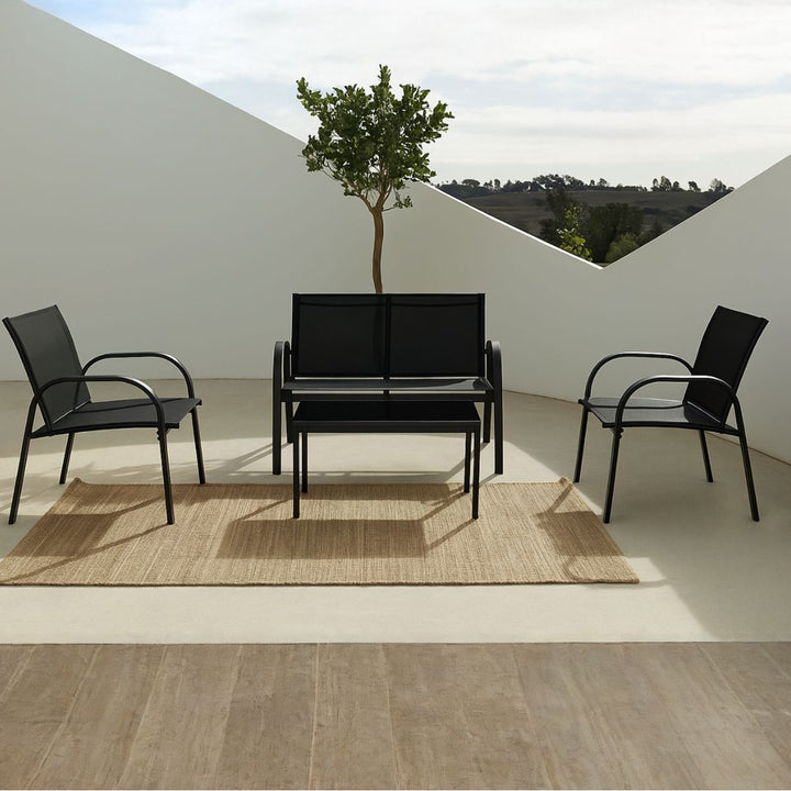 Vores sæt med 4 siddepladser, bestående af en 3-personers siddegruppe og et bord, er perfekt til din terrasse, veranda eller have, hvor du kan nyde afslappende øjeblikke sammen med venner og familie. Stolene er lavet af åndbart og hudvenligt materiale og er lavet af pulverlakeret jern for ekstra beskyttelse mod rust i nedbør og ved langvarig brug.