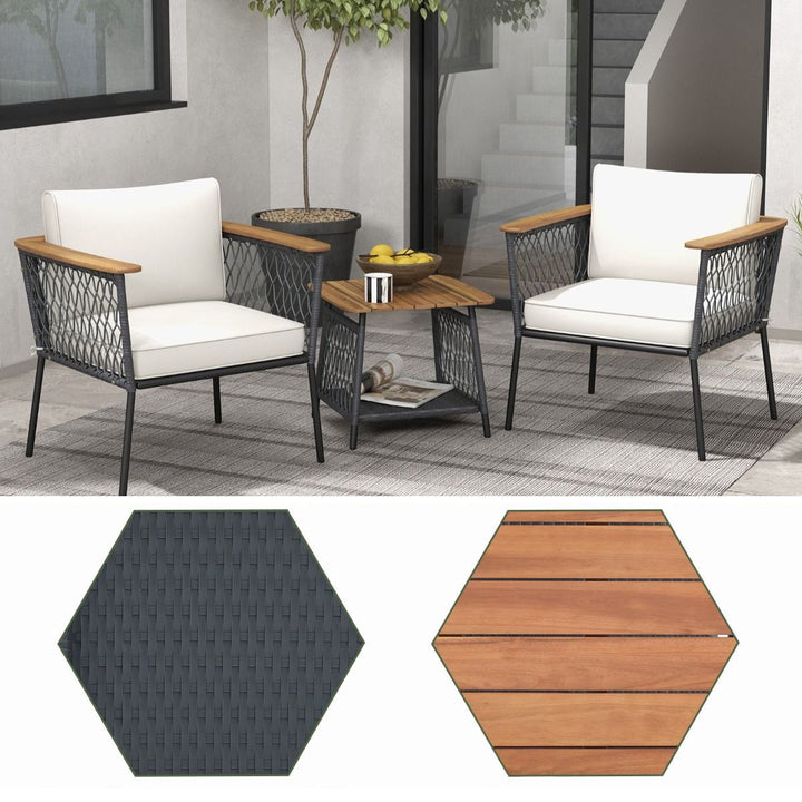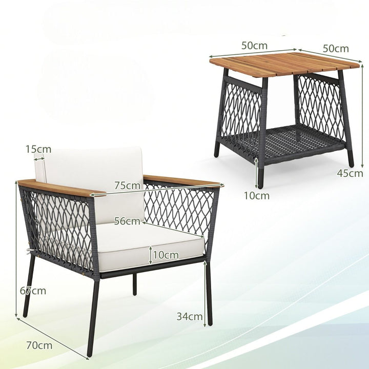 Dette sæt indeholder professionelt fremstillede stole og et sofabord lavet af førsteklasses grå PE-rattan, suppleret med armlæn i massivt akacietræ og en elegant bordplade. Det 2-lags sofabord giver ikke kun rigelig plads til afslappende fornødenheder, men forbedrer også dets praktiske appel med sin ekstra rattanhylde. Komfort er i højsædet med ultrakomfortable, elastiske hynder, der har glatte lynlåse og fastgørelsesstropper for at forhindre glidning.